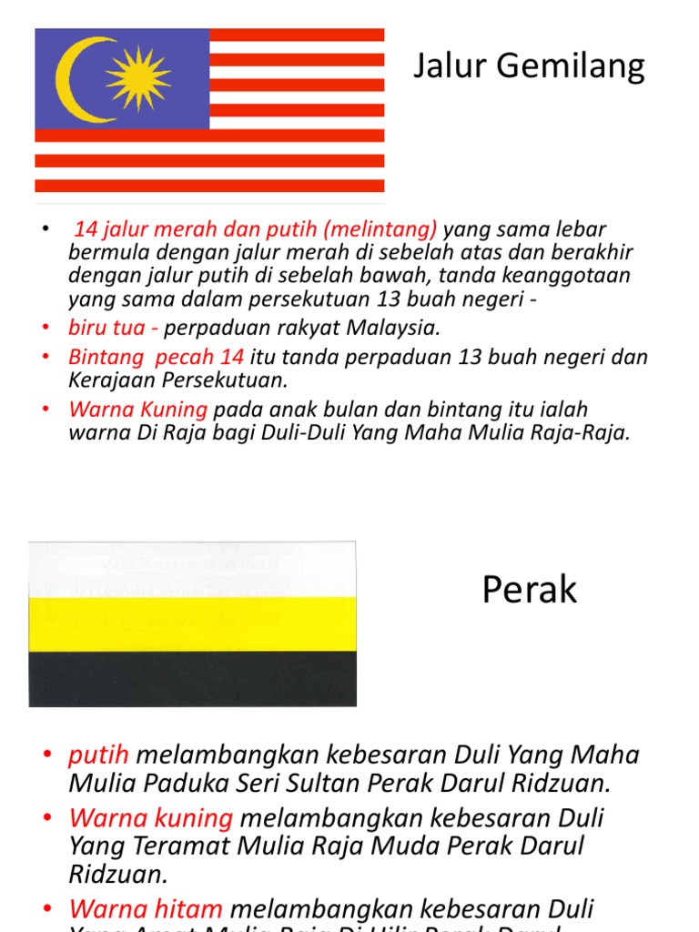 Amalan murni rakyat Malaysia. CADANGAN BENDERA PERSEKUTUAN TANAH MELAYU PADA TAHUN LALU 6 LAGU JALUR GEMILANG Merahmu bara semangat waja Putihmu bersih budi pekerti Kuning berdaulat. Jalur Gemilang is composed of a field of 14 alternating red and white stripes along the fly and a blue canton bearing a crescent and a 14-point star known as the Bintang Persekutuan Federal.